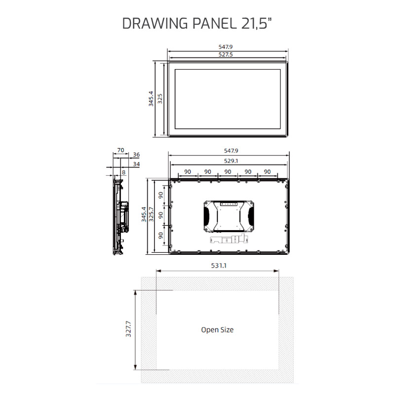Resolução nativa: 1920×1080 Contraste: 500:1 / Brilho: 300 cd/m2 Temp. funcionamento: 0 ~ 55 °C |