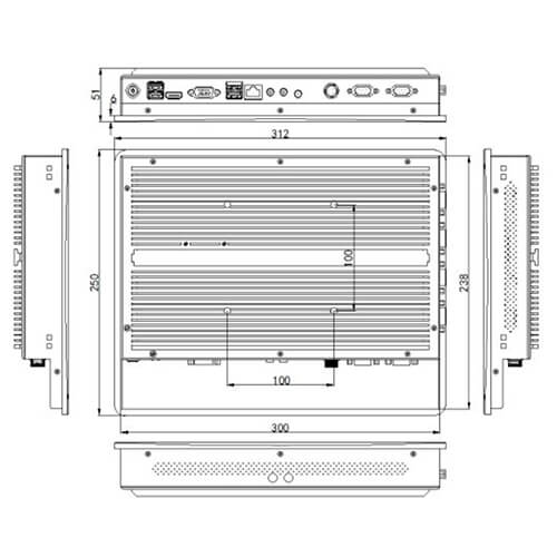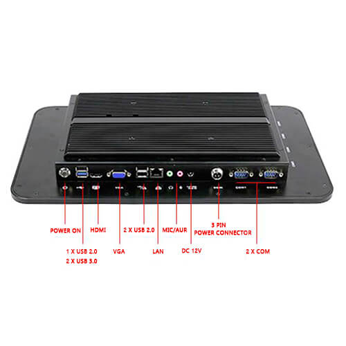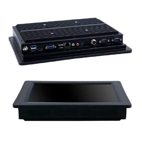 Painel PC Industrial táctil de 12,1″ INTEL i5 de 1,90GHz com processador de 4ª geração 4300u. Monitor táctil de 12,1″ com tecnologia capacitiva e computador fanless resistente em chassi de alumínio na cor preta, com sistema de refrigeração passiva sem uso de ventiladores. Possui dupla saída de vídeo HDMI e VGA para conexão de 1 monitor externo que, com sua própria tela, possibilita o funcionamento com 2 telas ao mesmo tempo. 4 portas USB (1 x 3.0 e 3 x 2.0). Sistema de montagem VESA ou painelável com o uso de suportes fornecidos.