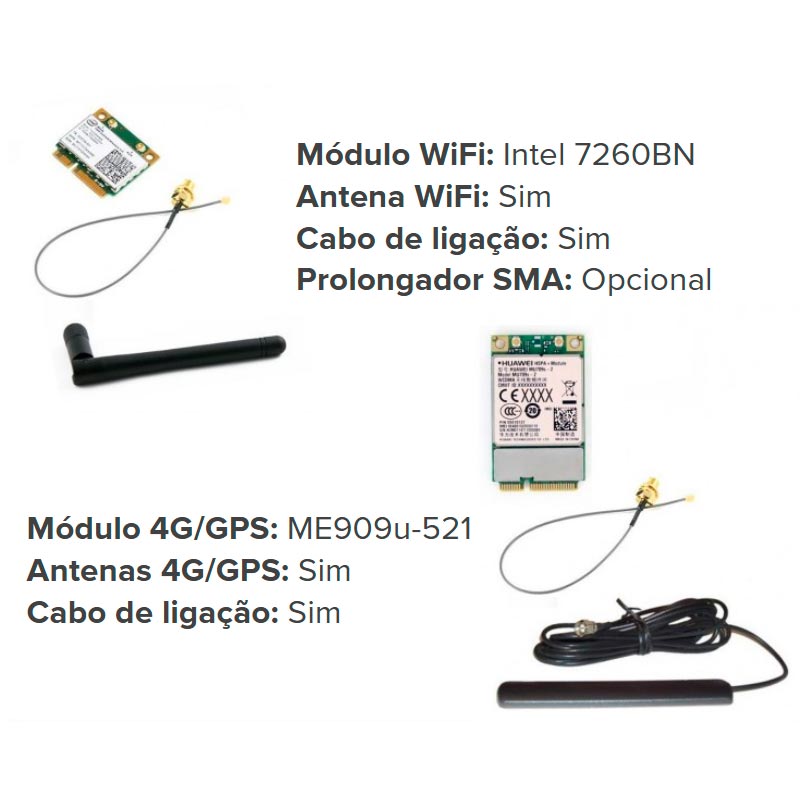 | Conectividade Opcional | Wi-Fi: Mini PCI Express Intel 7260BN (802.11 b/g/n) GPS: Mini PCI Express u-Blox pci-5s-1 – 500 3G/GPS: Mini PCI Express Huawei EM770w 4G/GPS: Mini PCI Express Huawei ME909u-521 |